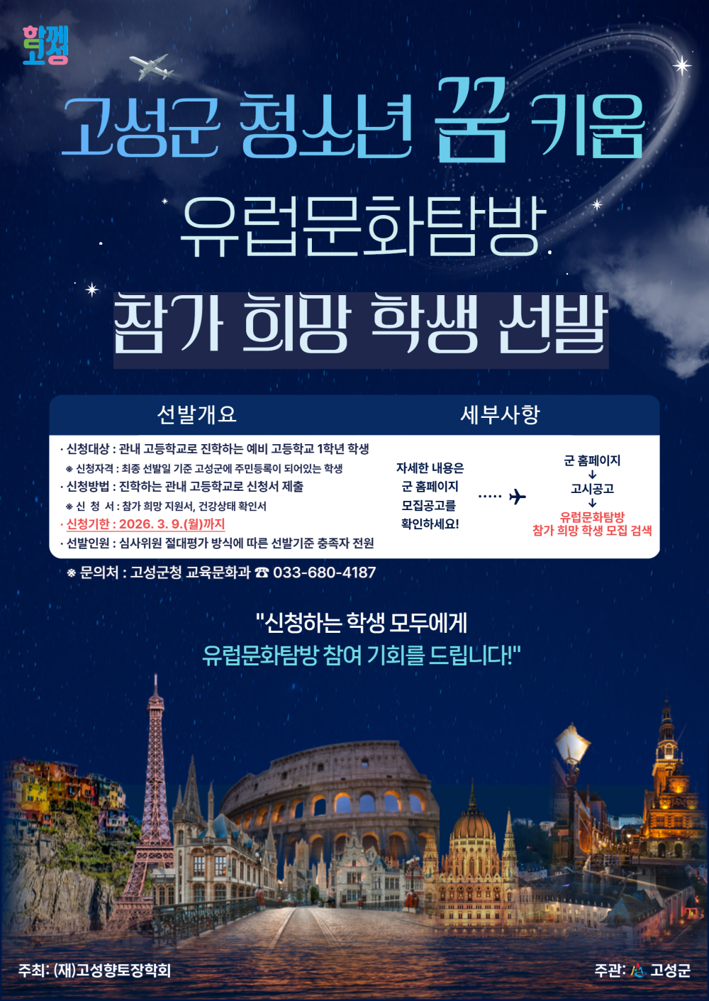 [고성군] 2026년 고성군 청소년 꿈 키움 유럽문화탐방 「참가 희망 학생 선발」