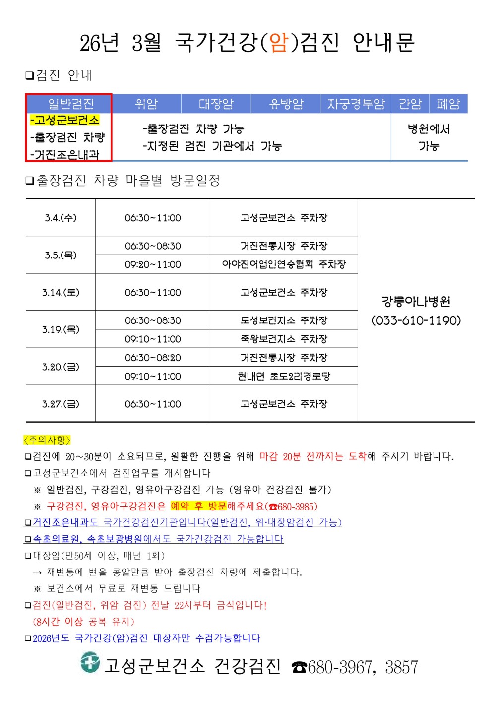 [고성군] 2026년 3월 국가건강(암) 출장검진차량 일정 안내 …