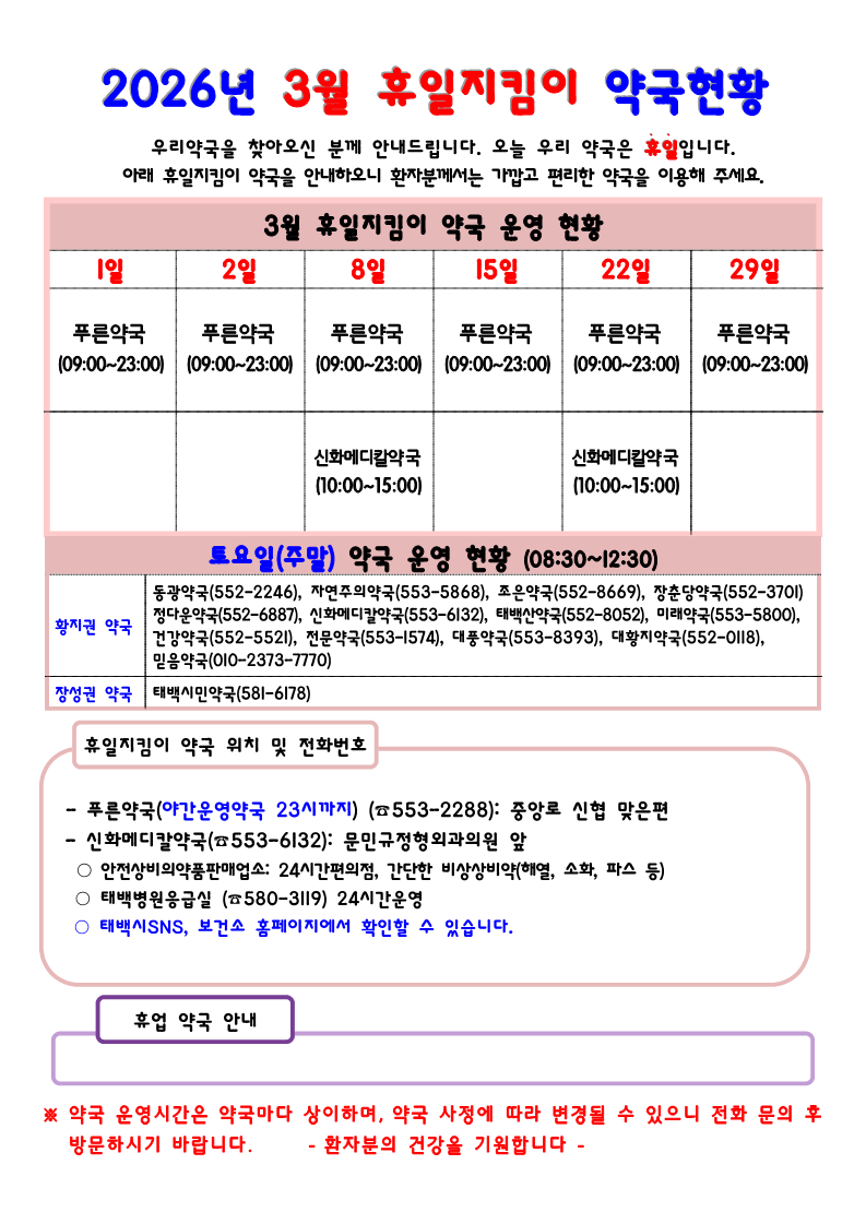 [태백시] 2026년 3월 휴일지킴이 약국 안내 Home시군별소식62326 윈디 윈디님의 홈 전체게시물 아이디로 검색 윈디님의 홈 전체게시물 아이디로 검색 2026.02.24 12:20 458 0 0 LV.1 62% 첨부파일 : () 다운로드 관련링크 : https://www.taebaek.go.kr/www/selectBbsNttView.do?key=351&bbsNo=24&nttNo=177404&searchCtgry=&searchCnd=all&searchKrwd=&pageIndex=1&integrDeptCode= 39회 연결 신고 목록 게시글 신고 안내 아래 내용중 해당하는 내용이 있을경우 아래 게시글신고 버튼을 클릭하시고 사유를 작성해주시면 빠른시간 안에 삭제및 필요조치하여 드리겠습니다. 로그인후 이용이 가능합니다. 그리고 답변은 메뉴 아이러브강원 > 1:1문의에서 확인이 가능합니다. 자신 또는 제3자를 비방하거나 중상 모략으로 명예를 손상시키는 내용 범죄행위와 관련이 있다고 판단되는 내용 다른 회원 또는 제3자의 저작권 등 기타 권리를 침해하는 내용 타인의 개인정보, 사생활을 침해하거나 명예를 손상시키는 경우 자신의 글을 타인이 도용한 경우 위의 내용 이외에 기타사항 본문 아래와 같이 휴일지킴이 약국을 안내드립니다. 가깝고 편리한 약국을 이용해주세요. 사진 확대보기 [출처 : 태백시청 -시정소식-] 0 로그인 후 추천을 하실 수 있습니다. 윈디 님의 최신글 윈디 님의 최신댓글 채용정보 - 주간보호 요양보호사 모집 2026-03-04 시군별소식 - 지방소득세(2025년귀속) 연말정산 환급신청 안내 2026-03-04 시군별소식 - 혈당 조절의 첫 걸음, 금연부터 시작해요! 2026-03-04 채용정보 - 매장 직원 모집 2026-03-04 시군별소식 - 수렵면허시험 문제은행 수정본 배포 2026-03-04 시군별소식 - 반려동물 놀이터 개장 안내 2026-03-04 시군별소식 - 2026 꿈꾸는 예술터 기획프로그램 개최 안내 2026-03-03 채용정보 - 2026년 영농부산물 안전처리 지원 기간제 근로자 채용공고 2026-03-03 Q&A - 청주시외버스터미널에서 춘천시외버스터미널에 가는 시외버스의 운행시간표랑 청주시외버스터미널에서 춘천시외버스터미널에 가는 시외버스의 요금입니다청주시외버스터미널에서 춘천시외버스터미널에 가는 시외버스의 운행시간표랑 청주시외버스터미널에서 춘천시외버스터미널에 가는 시외버스의 요금10:05 -> 13:11 소요시간 3시간 06분 요금 일반 21,800원 아동 10,900원 중고생 17,400원15:25 -> 18:31 소요시간 3시간 06분 요금 일반 21,800원 아동 10,900원 중고생 17,400원16:05 -> 19:11… 2026-03-07 Q&A - 조용하고 풍경 진짜 좋아요 ㅎㅎ 편의시설은 약간 부족해서 준비해 가는 게 낫답니다! 주변 맛집은 해산물 위주로 괜찮았어요~ 참고하세요! 2026-02-25 유머 - 부산, 울산, 대구에 눈오면 난리가 납니다. 1년에 눈다운 눈은 한번오면 많이 옵니다. 2026-02-20 유머 - 우와 뒤배도 눈으로? 2026-02-20 Q&A - 아시겠지만 각종 어플로 찾아보시면 질문자님 마음에 드는곳을 찾으실수있을거에요,~ 여기서보다 어플로보면 사진도 볼수있으니깐 더 마음이 놓일것같아요 ~ 좋은여행되시길바랍니다 2026-02-10 뽐&팁 - 좋은팁 감사해용.... 2025-07-07 윈디 님의 최신글 윈디 님의 최신댓글 채용정보 - 주간보호 요양보호사 모집 2026-03-04 시군별소식 - 지방소득세(2025년귀속) 연말정산 환급신청 안내 2026-03-04 시군별소식 - 혈당 조절의 첫 걸음, 금연부터 시작해요! 2026-03-04 채용정보 - 매장 직원 모집 2026-03-04 시군별소식 - 수렵면허시험 문제은행 수정본 배포 2026-03-04 시군별소식 - 반려동물 놀이터 개장 안내 2026-03-04 시군별소식 - 2026 꿈꾸는 예술터 기획프로그램 개최 안내 2026-03-03 채용정보 - 2026년 영농부산물 안전처리 지원 기간제 근로자 채용공고 2026-03-03 Q&A - 청주시외버스터미널에서 춘천시외버스터미널에 가는 시외버스의 운행시간표랑 청주시외버스터미널에서 춘천시외버스터미널에 가는 시외버스의 요금입니다청주시외버스터미널에서 춘천시외버스터미널에 가는 시외버스의 운행시간표랑 청주시외버스터미널에서 춘천시외버스터미널에 가는 시외버스의 요금10:05 -> 13:11 소요시간 3시간 06분 요금 일반 21,800원 아동 10,900원 중고생 17,400원15:25 -> 18:31 소요시간 3시간 06분 요금 일반 21,800원 아동 10,900원 중고생 17,400원16:05 -> 19:11… 2026-03-07 Q&A - 조용하고 풍경 진짜 좋아요 ㅎㅎ 편의시설은 약간 부족해서 준비해 가는 게 낫답니다! 주변 맛집은 해산물 위주로 괜찮았어요~ 참고하세요! 2026-02-25 유머 - 부산, 울산, 대구에 눈오면 난리가 납니다. 1년에 눈다운 눈은 한번오면 많이 옵니다. 2026-02-20 유머 - 우와 뒤배도 눈으로? 2026-02-20 Q&A - 아시겠지만 각종 어플로 찾아보시면 질문자님 마음에 드는곳을 찾으실수있을거에요,~ 여기서보다 어플로보면 사진도 볼수있으니깐 더 마음이 놓일것같아요 ~ 좋은여행되시길바랍니다 2026-02-10 뽐&팁 - 좋은팁 감사해용.... 2025-07-07 SNS 댓글목록 0 등록된 댓글이 없습니다.