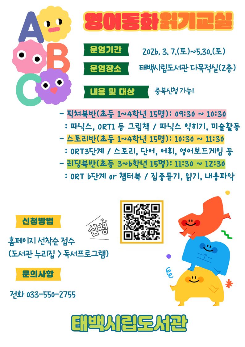 태백시립도서관 2026년 상반기 영어동화읽기교실을 다음과 같이 운영하오니 많은 참여 부탁드립니다.