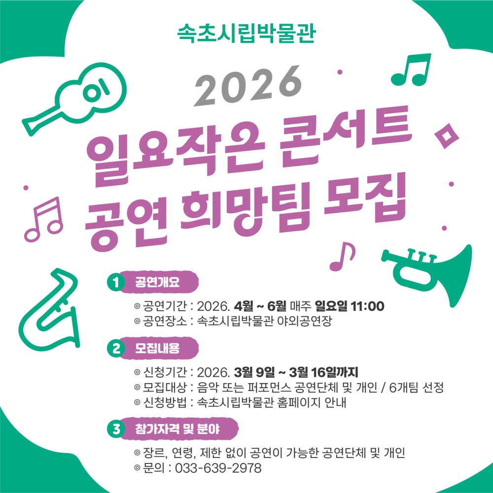속초시립박물관에서는 시민들을 위한 문화예술 향유 기회의 확대와 더불어 관람객들에게는 보다 많은 볼거리를 제공하고자 일요 작은 콘서트를 개최합니다. 이에 따라 문화예술 공연단(음악 및 퍼포먼스)을 아래와 같이 모집하오니, 공연단체 및 개인 여러분의 많은 관심과 참여를 부탁드립니다.