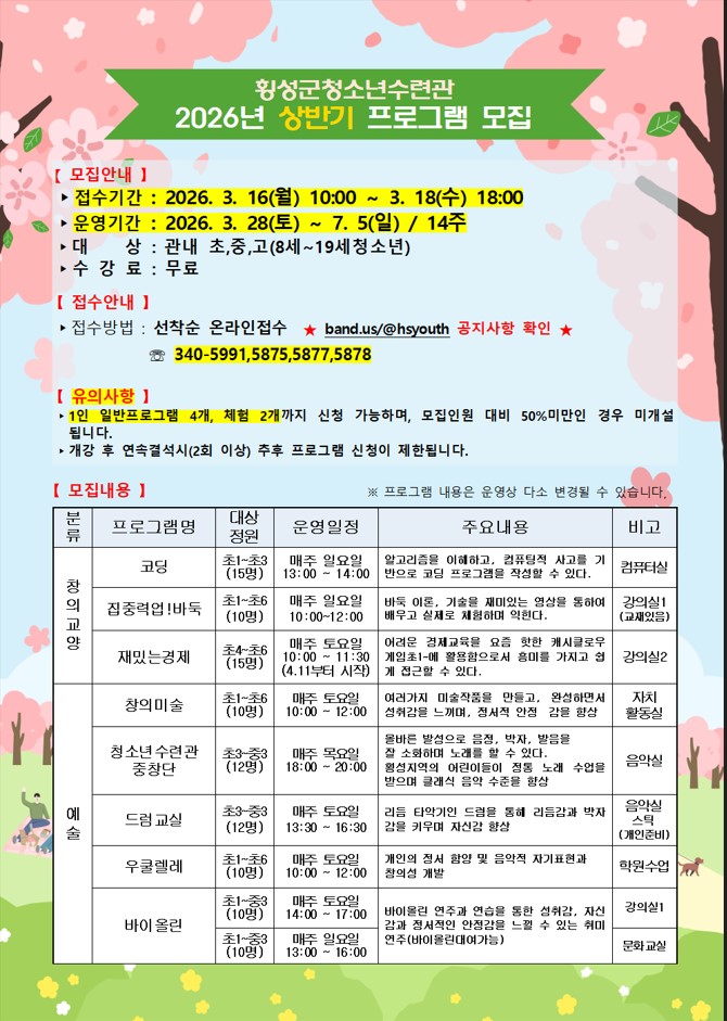 [횡성군] [대표] 횡성군청소년수련관 2026년 상반기 프로그램 참여자 모집 안내