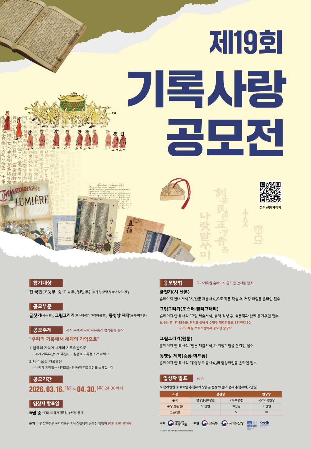2026년 유네스코 세계유산위원회 개최를 맞아 세계와 한국 기록유산의 의미를 되새기고 그 소중함을 공유하는 장을 마련하고자 전 국민을 대상으로 ‘제19회 기록사랑 공모전’을 개최하니, 많은 관심과 참여 바랍니다.