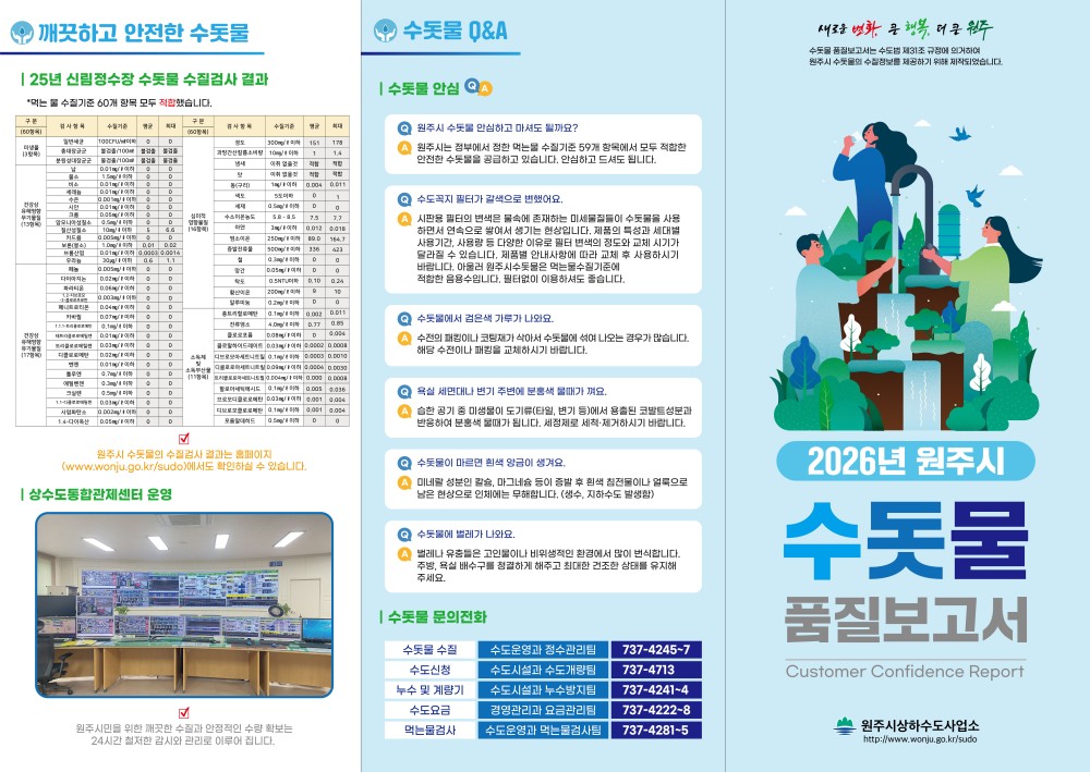 [원주시] 2026년 원주시 수돗물 품질보고서 발행 Home시군별소식62778 해바라기 해바라기님의 홈 전체게시물 아이디로 검색 해바라기님의 홈 전체게시물 아이디로 검색 2026.03.17 16:20 124 0 0 LV.1 13% 관련링크 : https://www.wonju.go.kr/www/selectBbsNttView.do?key=211&bbsNo=1&nttNo=480131&searchCtgry=&searchCnd=all&searchKrwd=&pageIndex=1&integrDeptCode= 7회 연결 신고 목록 게시글 신고 안내 아래 내용중 해당하는 내용이 있을경우 아래 게시글신고 버튼을 클릭하시고 사유를 작성해주시면 빠른시간 안에 삭제및 필요조치하여 드리겠습니다. 로그인후 이용이 가능합니다. 그리고 답변은 메뉴 아이러브강원 > 1:1문의에서 확인이 가능합니다. 자신 또는 제3자를 비방하거나 중상 모략으로 명예를 손상시키는 내용 범죄행위와 관련이 있다고 판단되는 내용 다른 회원 또는 제3자의 저작권 등 기타 권리를 침해하는 내용 타인의 개인정보, 사생활을 침해하거나 명예를 손상시키는 경우 자신의 글을 타인이 도용한 경우 위의 내용 이외에 기타사항 본문 수도법 제31조 규정에 의거하여 26년도 원주시 수돗물 품질보고서를 발행하였습니다.[출처 : 원주시청 -시정소식-] 0 로그인 후 추천을 하실 수 있습니다. 해바라기 님의 최신글 해바라기 님의 최신댓글 채용정보 - 『늘동행요양원』 요양보호사 채용 공고 1시간 15분전 시군별소식 - 2026년 원주시 수돗물 품질보고서 발행 2026-03-17 시군별소식 - 2026년 재배기술 공개강좌 교육 안내 2026-03-16 채용정보 - 『원주연세재가복지센터』 방문요양보호사 채용 공고 (귀래면) 2026-03-16 채용정보 - 『삼성시니어재가복지센터』 방문요양보호사 채용 공고 (일산동) ★채용 완료★ 2026-03-16 채용정보 - 『희망방문요양센터』 방문요양보호사 채용 공고 (우산동) 2026-03-13 유머 - 1300만원 카다이프 머신을 야매로 직접 만든 유튜버 2026-03-13 채용정보 - 『한국도로교통공단 (본부)』 임시고용원(일용직) 채용 공고 2026-03-12 최신글이 없습니다. 해바라기 님의 최신글 해바라기 님의 최신댓글 채용정보 - 『늘동행요양원』 요양보호사 채용 공고 1시간 15분전 시군별소식 - 2026년 원주시 수돗물 품질보고서 발행 2026-03-17 시군별소식 - 2026년 재배기술 공개강좌 교육 안내 2026-03-16 채용정보 - 『원주연세재가복지센터』 방문요양보호사 채용 공고 (귀래면) 2026-03-16 채용정보 - 『삼성시니어재가복지센터』 방문요양보호사 채용 공고 (일산동) ★채용 완료★ 2026-03-16 채용정보 - 『희망방문요양센터』 방문요양보호사 채용 공고 (우산동) 2026-03-13 유머 - 1300만원 카다이프 머신을 야매로 직접 만든 유튜버 2026-03-13 채용정보 - 『한국도로교통공단 (본부)』 임시고용원(일용직) 채용 공고 2026-03-12 최신글이 없습니다. SNS 댓글목록 0 등록된 댓글이 없습니다.