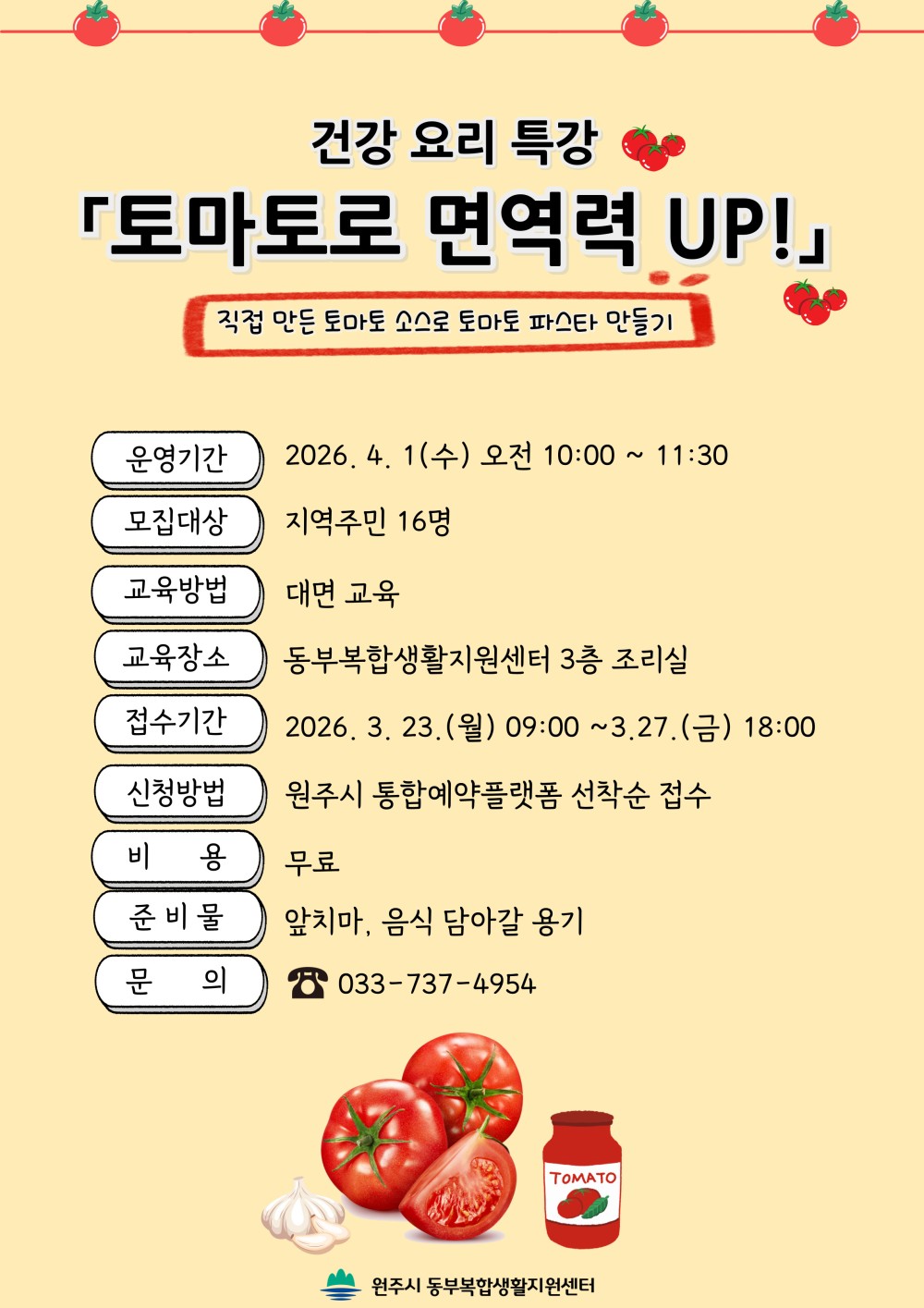 [원주시] 동부복합생활지원센터 건강관 「토마토로 면역력 UP!」 건강 요리 특강 참여자 모집