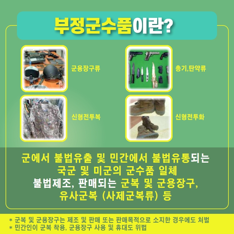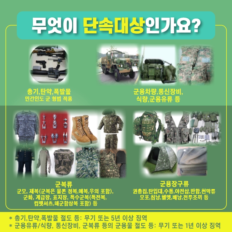 - 군에서 불법유출 및 민간에서 불법유통되는 국군 및 미군의 군수품 일체