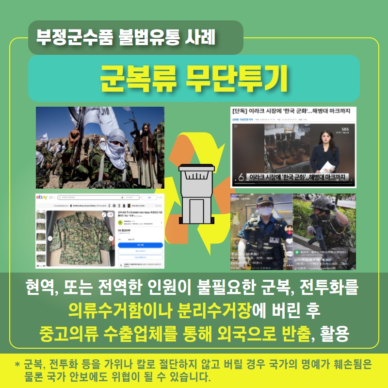 - 현역 또는 전역한 인원이 불필요한 군복, 전투화를 의료수거함이나 분리수거장에 버린 후 중고의류 수출업체를 통해 외국으로 반출, 활용