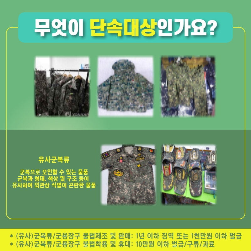 - 불법제조, 판매되는 군복 및 군용장구, 유사군복 (사제군복류) 등